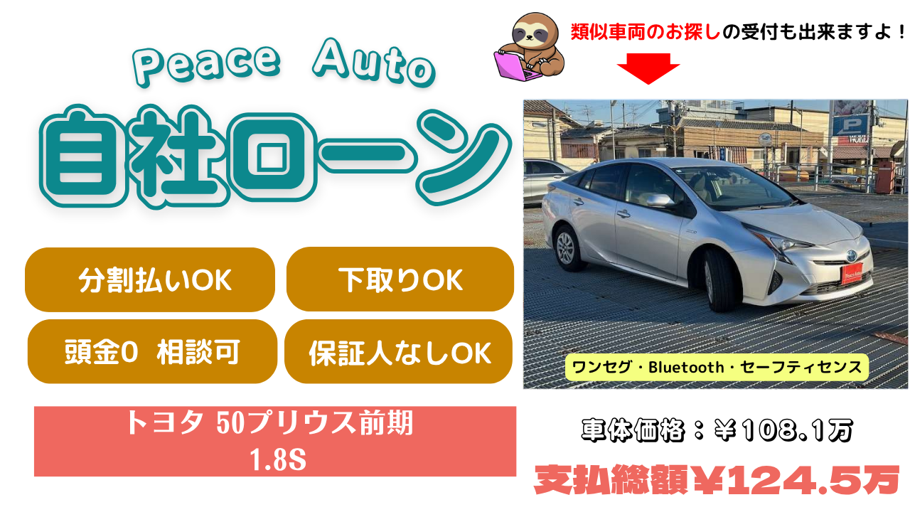 | トヨタ プリウス50前期 1.8 S 年式:2016(H28) 総支払額:124.5万 月々支払い額:28,700~30,000 (2025年5月までの平均的な統計) 走行距離数:10.3万km 補足:頭金=20,000円の場合 実質年率:6% 初回お支払:32,019円 月々お支払:28,700円 総支払回数:48回 支払回数:最大60回までOK ※月々のお支払い額やお支払い回数のご相談も承ります (頭金の金額で月々のお支払い額は変動します) 寝屋川市 自社ローン 大阪 ピースオート ![]() |