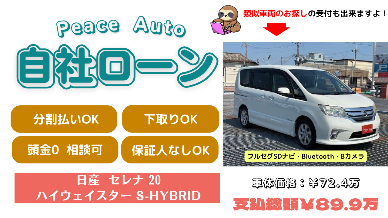 | 日産 セレナ2.0 ハイウェイスター S-HYBRID 年式:2013(H25) 総支払額:89.9万 月々支払い額:20,900~30,000 (2025年7月までの平均的な統計) 走行距離数:2.6万km 補足:頭金=9,000円の場合 実質年率:6% 初回お支払:20,980円 月々お支払:20,900円 総支払回数:48回 支払回数:最大60回までOK ※月々のお支払い額やお支払い回数のご相談も承ります (頭金の金額で月々のお支払い額は変動します) 寝屋川市 自社ローン 大阪 ピースオート ![]() |