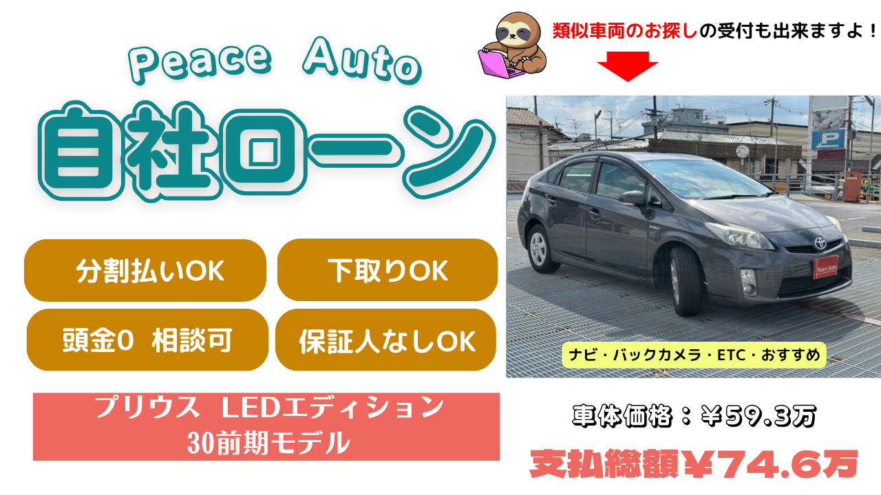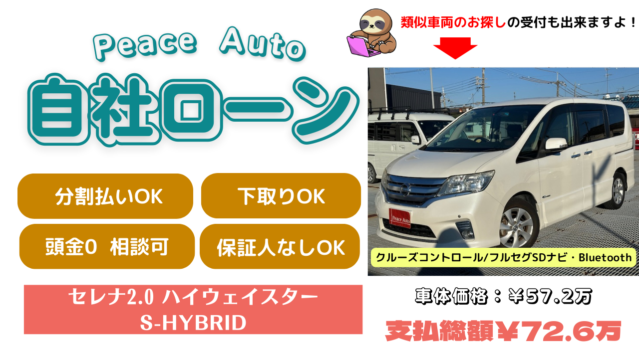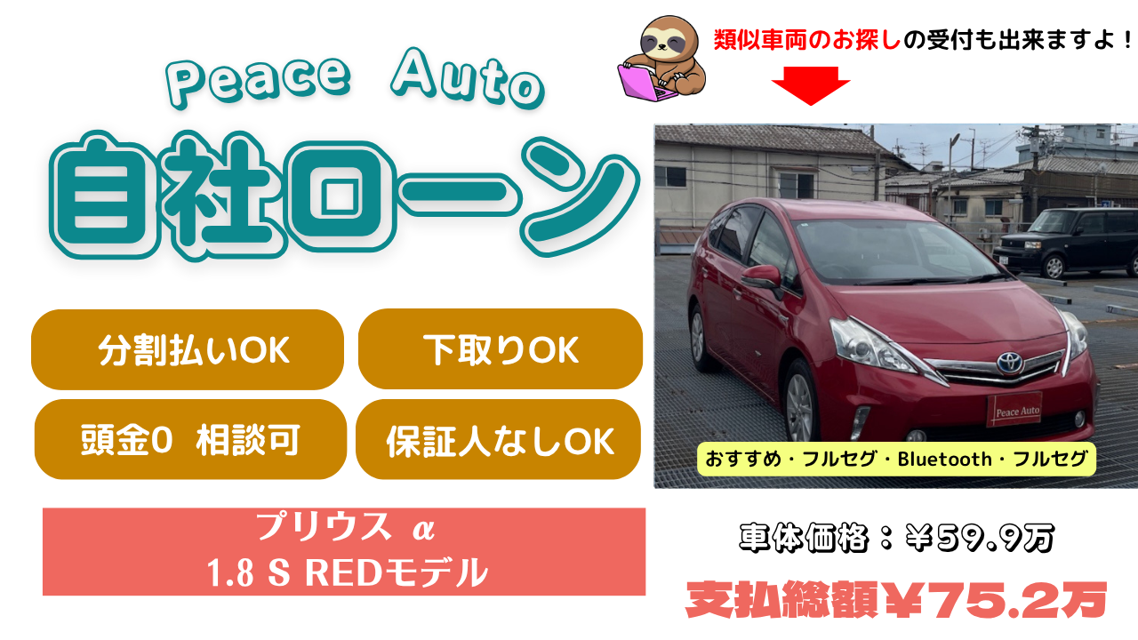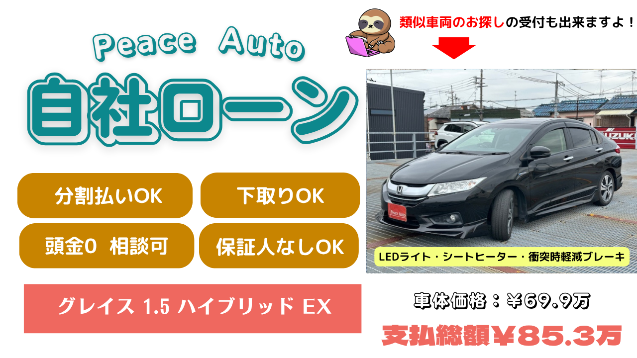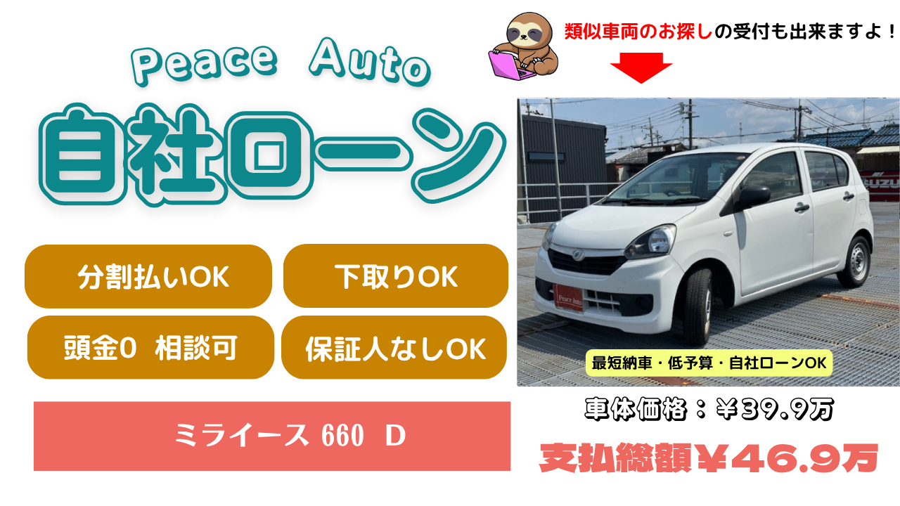 | 【当店だけの特典】 ・GPSなし(¥0) ・車検整備付き ・保証人不要 ・頭金自由設定 ・信用情報の回復あり |