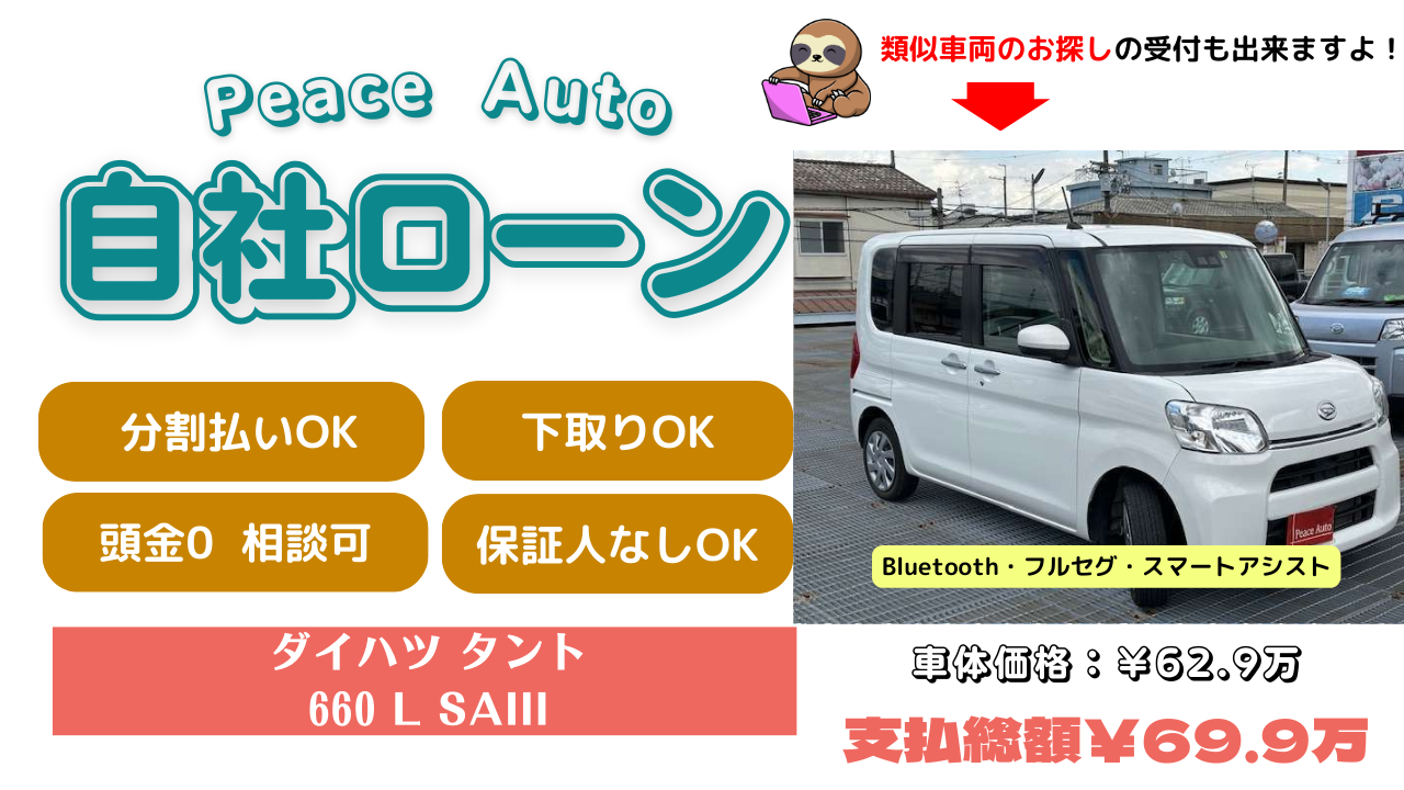 | 中古車 ダイハツ タント660 L SAIII 年式:2018(H30) 総支払額:69.9万 月々支払い額:20,900~30,000 (2025年3月までの平均的な統計) 走行距離数:8.6万km 補足:頭金=9,000円の場合 実質年率:6% 初回お支払:24,180円 月々お支払:20,900円 総支払回数:36回 支払回数:最大60回までOK ※月々のお支払い額やお支払い回数のご相談も承ります (頭金の金額で月々のお支払い額は変動します) 寝屋川市 自社ローン 大阪 ピースオート ![]() |